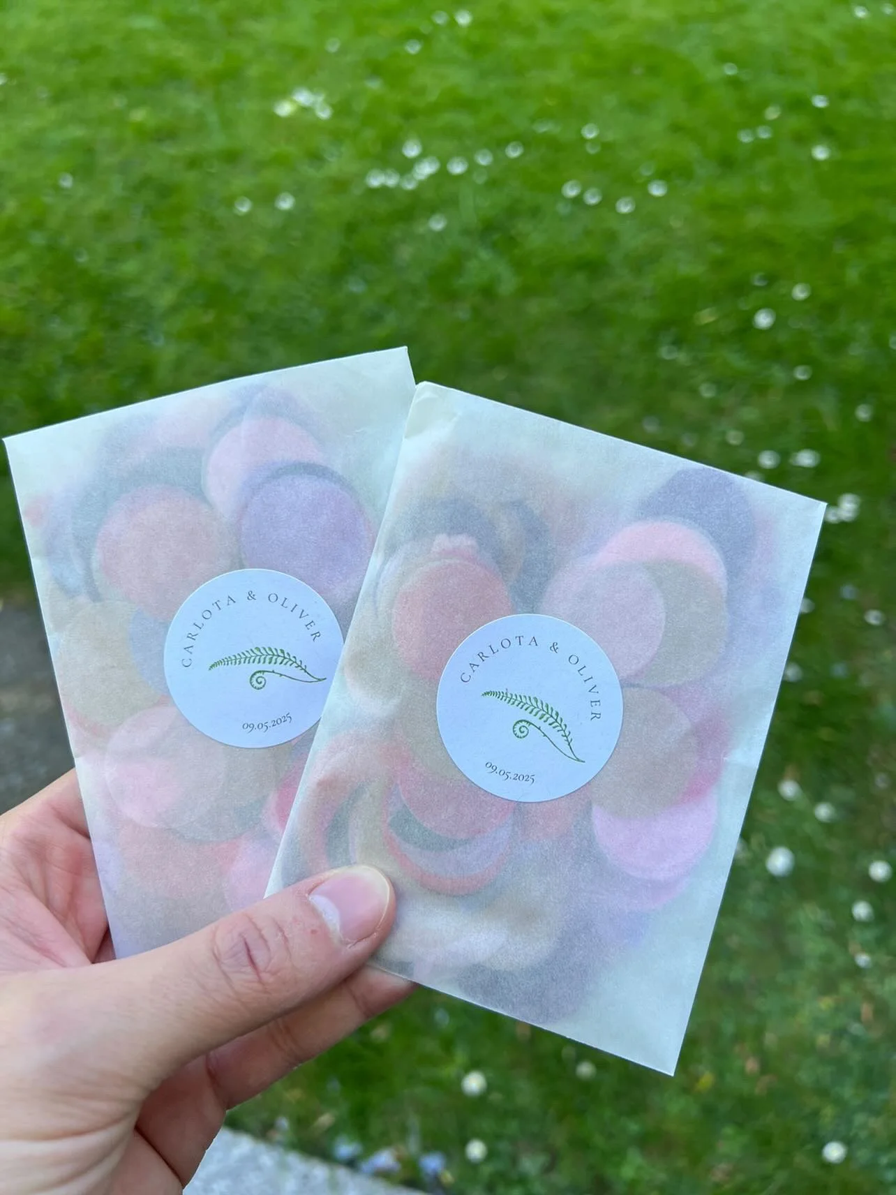 Carlota and Oliver were thrilled with the designs and made the final pieces their own, adding raffia and organza to the tags for their handmade favours, and applying the stickers to confetti packets - all to stunning effect.
